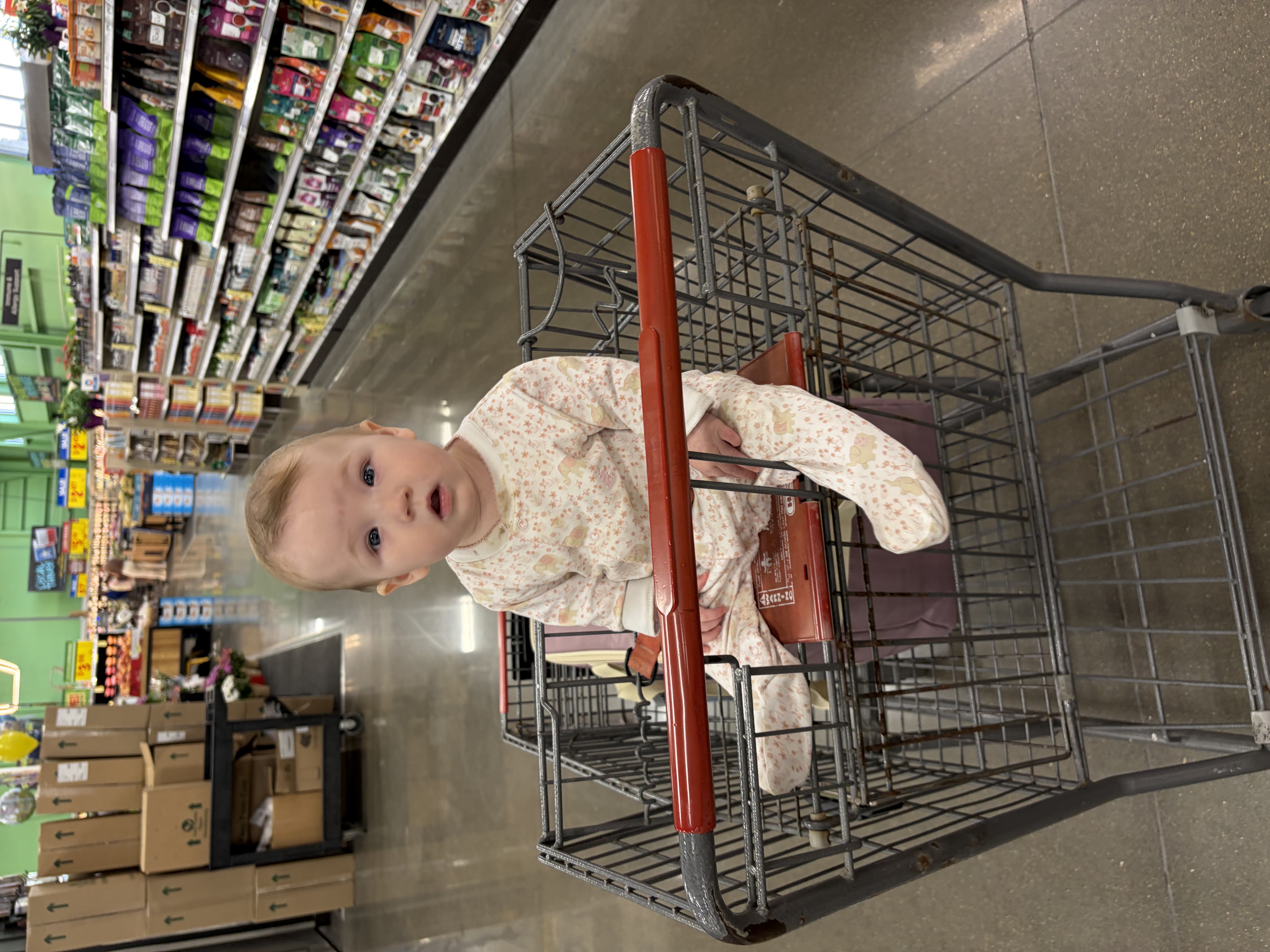Mia graduated to sitting up in the grocery cart. Much easier than having the car seat and groceries all in the basket.