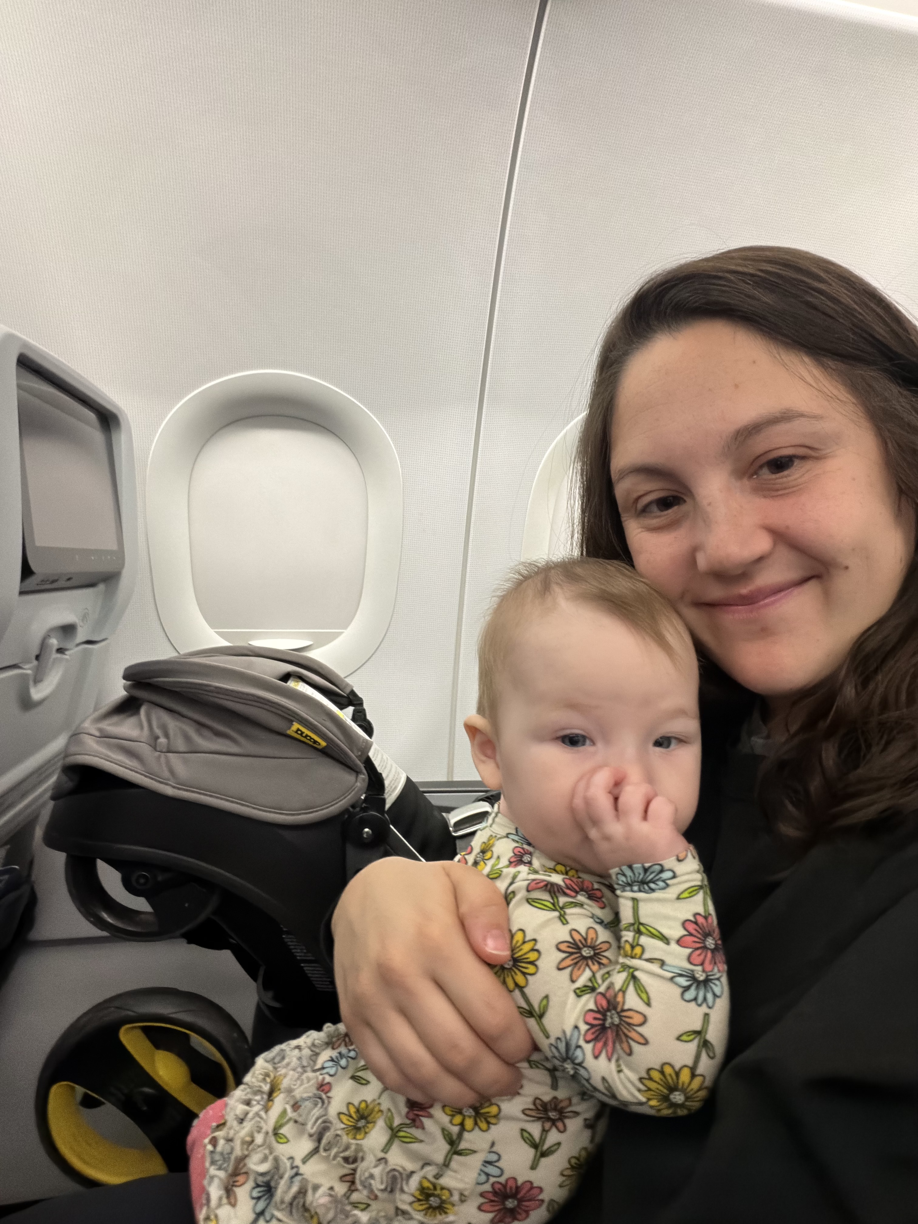 Mia and Katie are getting very comfortable flying alone, especially when they get their own row and can bring the carseat on board!