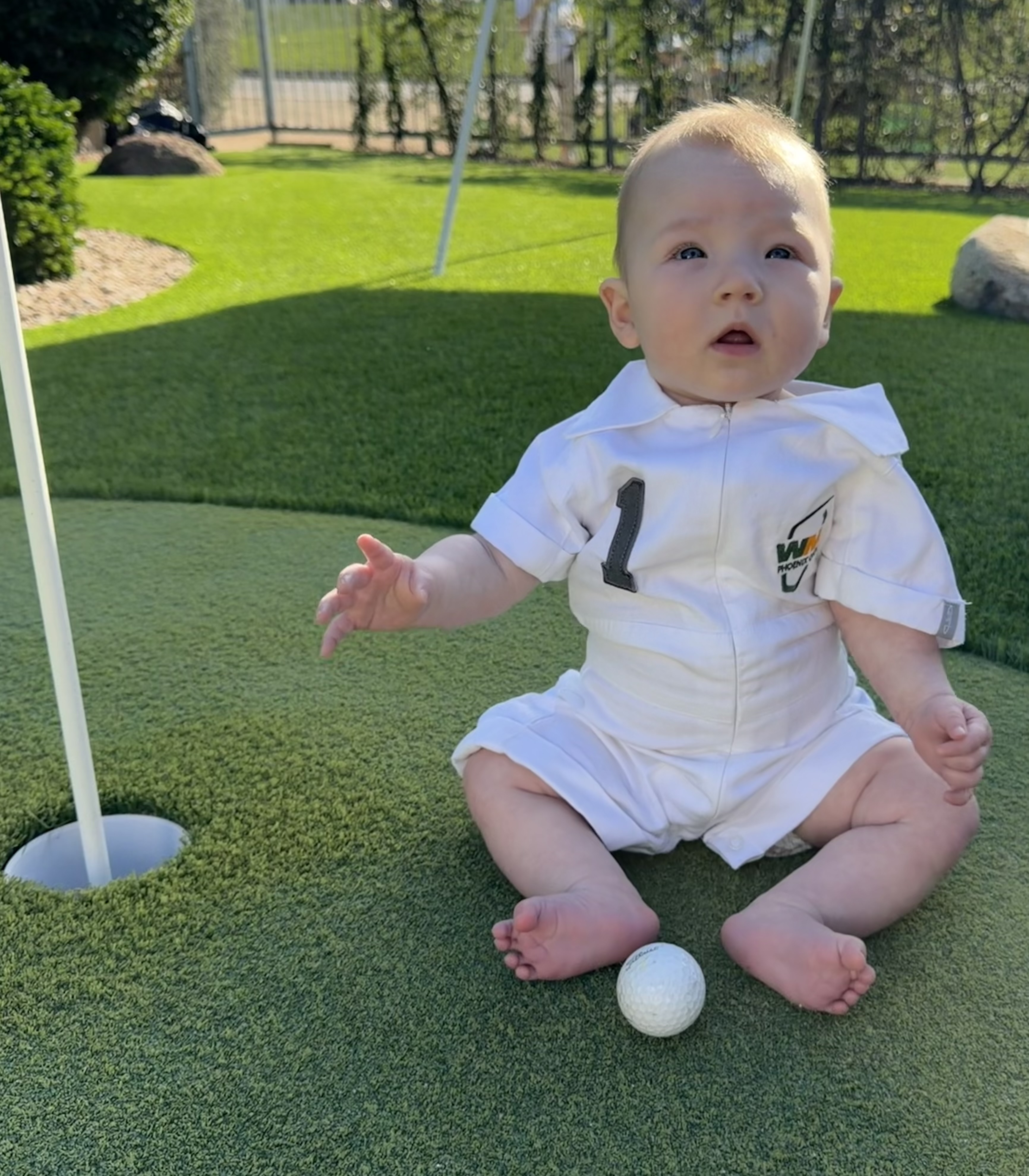 Mia's MeeMee (Amee, Katie's mom) insisted on buying this caddie outfit for the Waste Management Open and luckily Teddy (Ted, Katie's dad) has a putting area in the backyard to pose her for the photos. She was quieter than most attendees while watching the final putts of the tournament on 18 on Sunday.